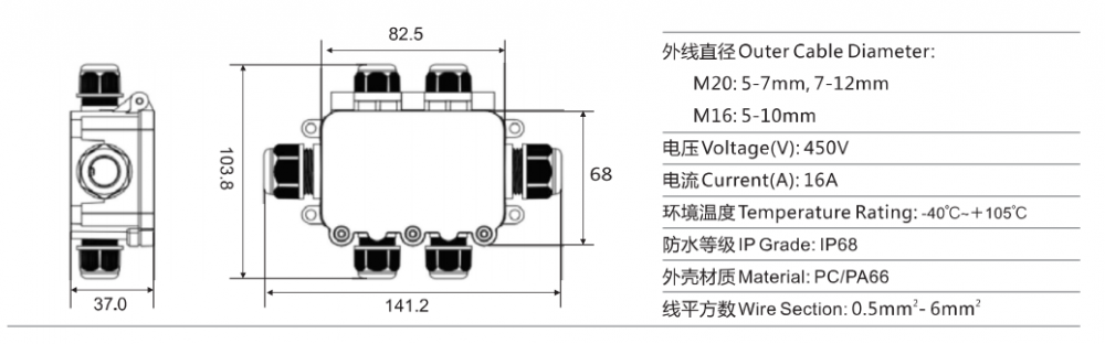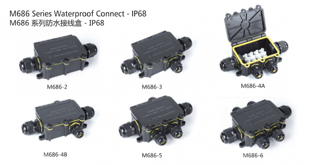 Water-proof Terminal Connector made by PC material, which can be widely used in different condition such as under grould or in the wall for water proof purpose.
